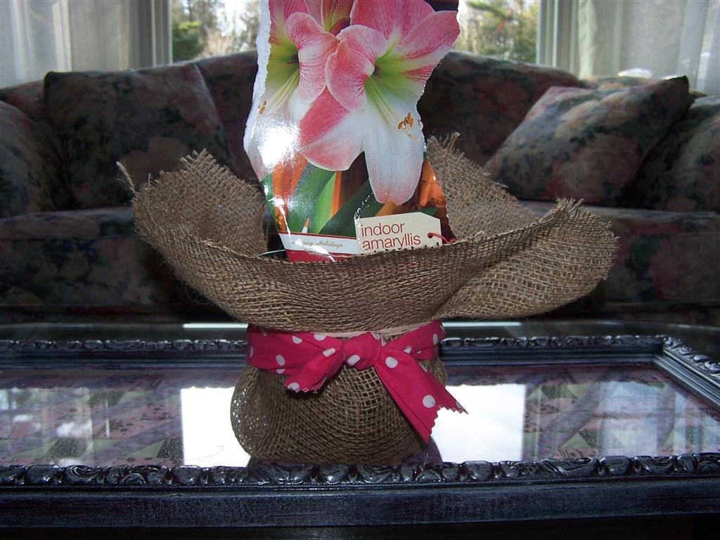 I secured the burlap with two rubber bands and then tied a piece of pink fabric to hide the rubber bands (though I see I was not all that successful hiding them). Now all I have to do wait 4 to 8 weeks for beautiful blooms.